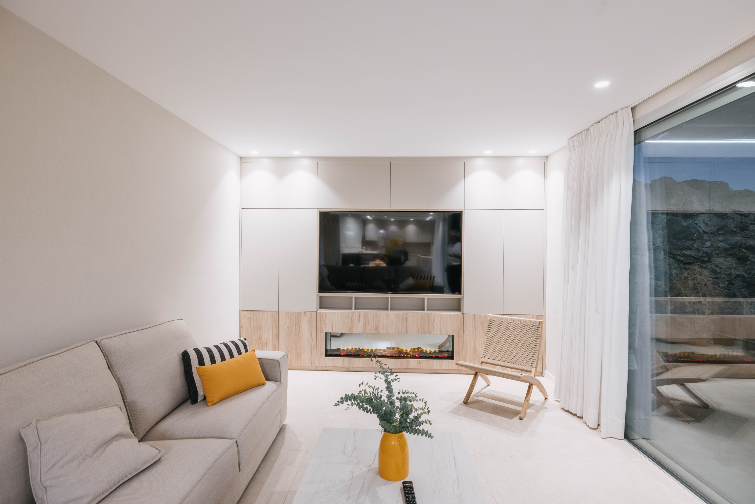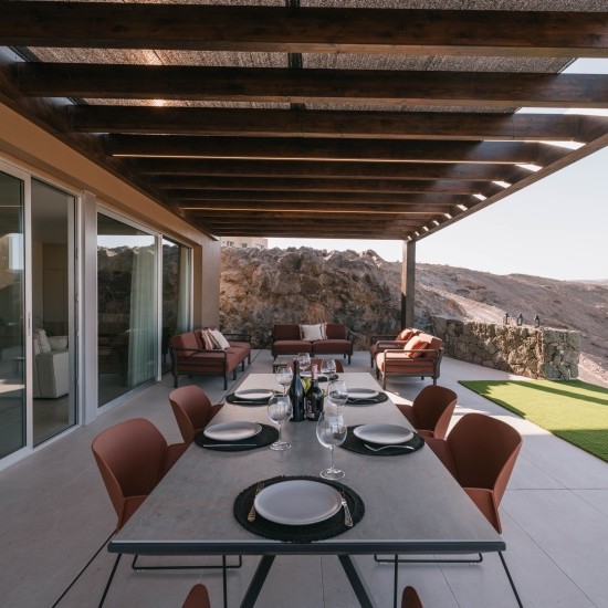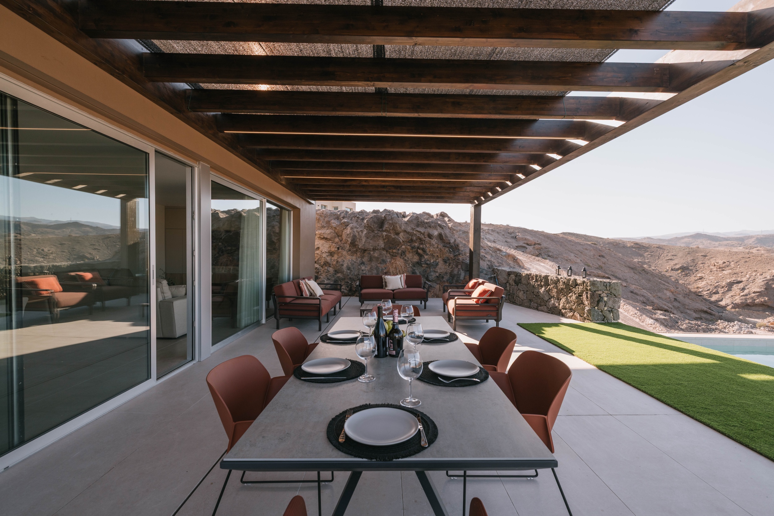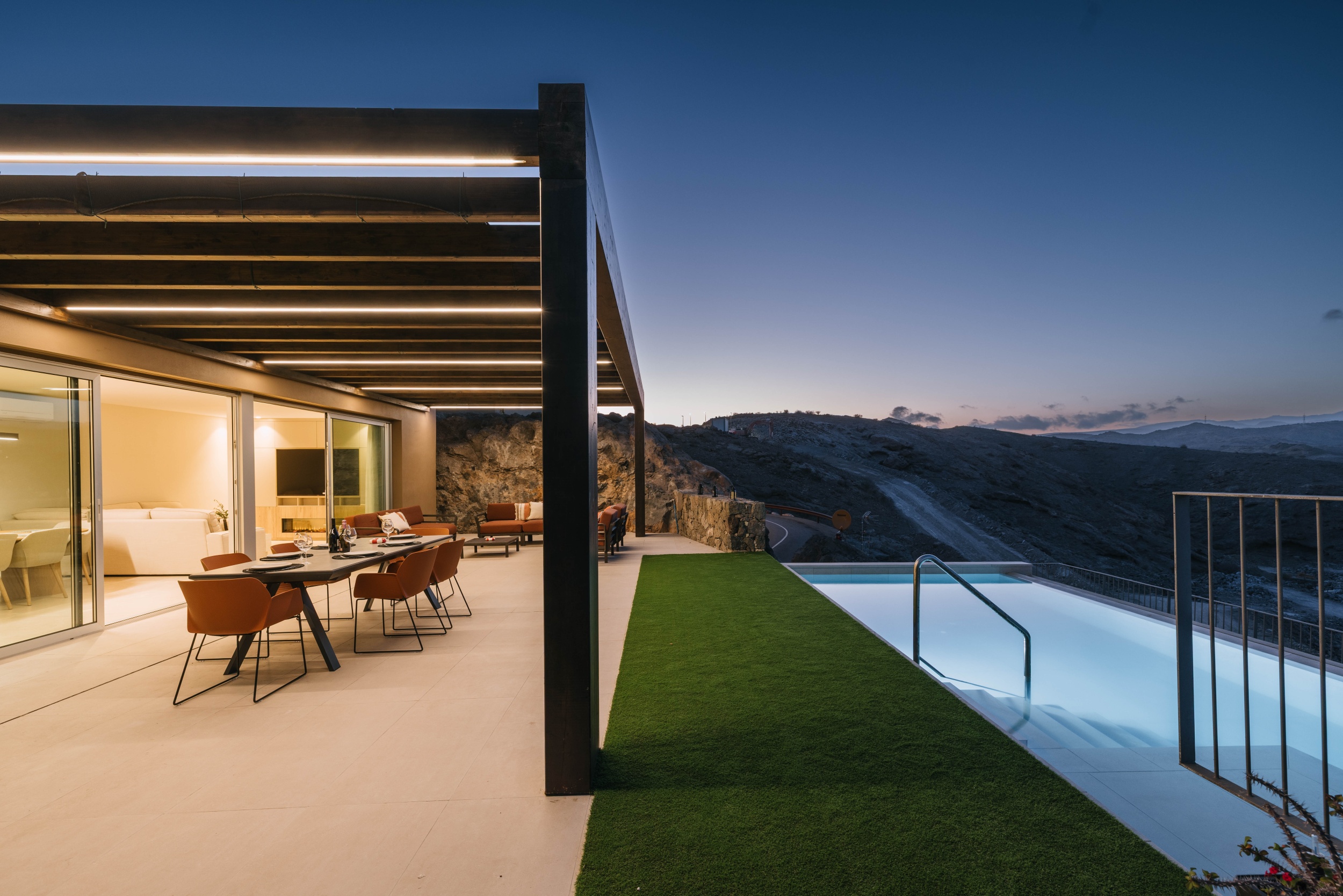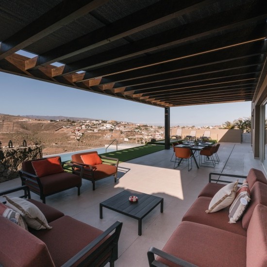 Unique villa with spectacular views of Roque Nublo and the mango plantation of El Salobre. Spread over a single floor, it has three bedrooms—two with double beds and one with two single beds—and offers two full bathrooms, an indoor toilet, and an outdoor toilet next to the pool, with capacity for up to six people. The villa faces north, ensuring sun on the pool until sunset, and has parking for four cars. Highlights include its south-facing terrace at the entrance, a pool with a sunbed area and spa-style jet, bathrooms with natural light thanks to skylights, and a cozy living room with an electric fireplace, ideal for enjoying a comfortable and elegant atmosphere.